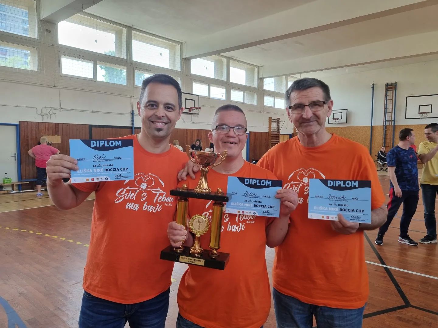 Milí priatelia chcem sa s Vami podeliť o vzácne momenty, ktoré sme prežili v sobotu 30.4.2022. Po dlhom období kedy sme nemohli trénovať a organizovať turnaje, sme sa zúčastnili priateľského turnaja Eliška Nike Boccia Cup v Bratislave v Boccii. V konkurencii 8 tímov, získal náš tím v zložení Peter Gregor, Imrich Daniš a Peter Mokroš bronz. Srdečne gratulujeme chlapci. Sme na vás hrdí. Momenty a emócie, ktoré zostanú v našich srdciach. Radosť Peťka Gregora, keď zdvihol nad hlavu víťazný pohár nám zarosila oči a bola tou naj odmenou. Chceme sa s vami podeliť o radosť a zároveň poďakovať všetkým, ktorí ste nám venovali 2% dane. Ďakujeme spoločnosti Nemak Slovakia s.r.o. Žiar nad Hronom. Ďakujeme všetkým za podporu