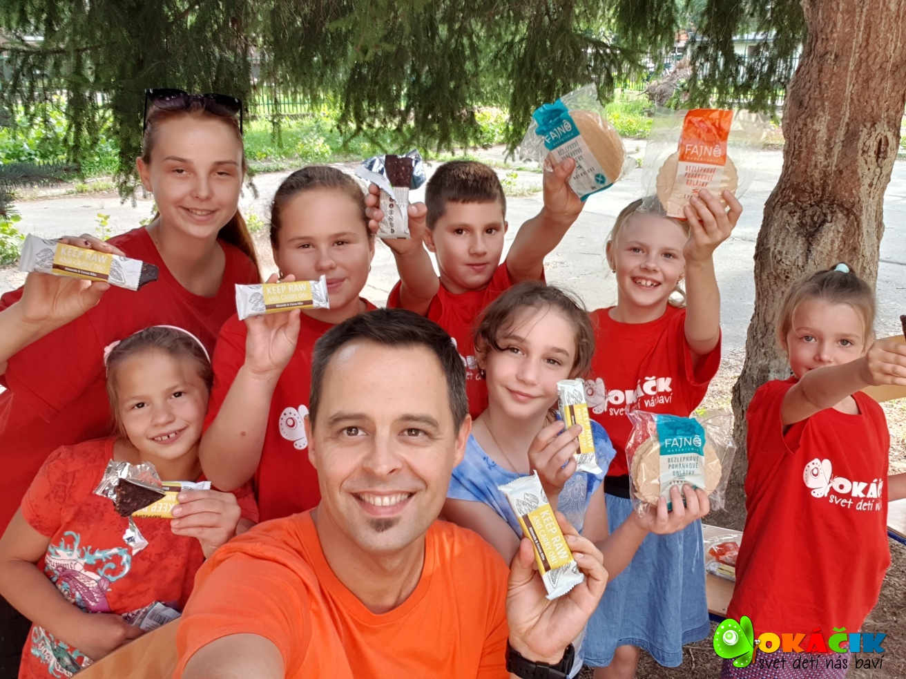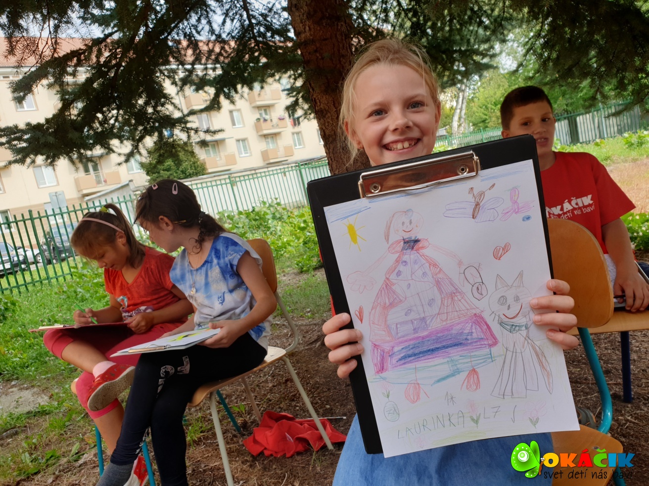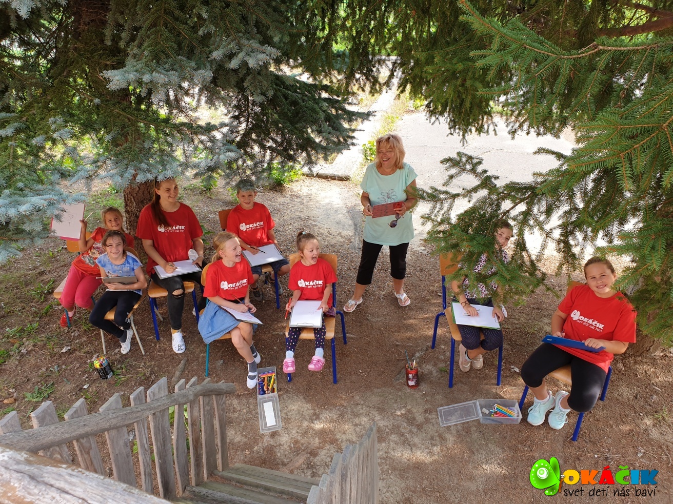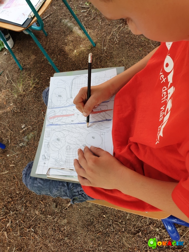 Dnes sme s deťmi tvorili na voľnú tému vonku, v príjemnom chládku vysokých smrekov. Pozrite si pár záberov. 🙂 Touto cestou ďakujeme firme Happylife za zdravé a chutné bio raw mandľové tyčinky a Fajnô maškrtenie – Bezgluténové pohánkové oblátky bryndzové a syrové. Všetkým veľmi chutili a energia spálená kreslením sa rýchlo dobila
