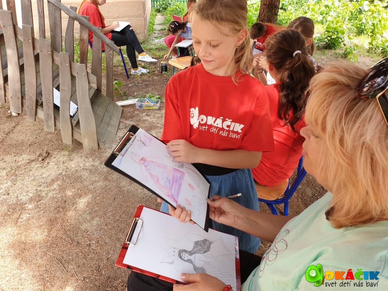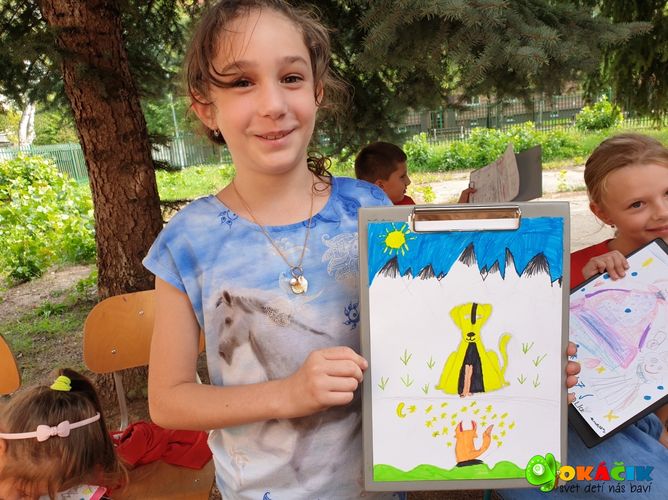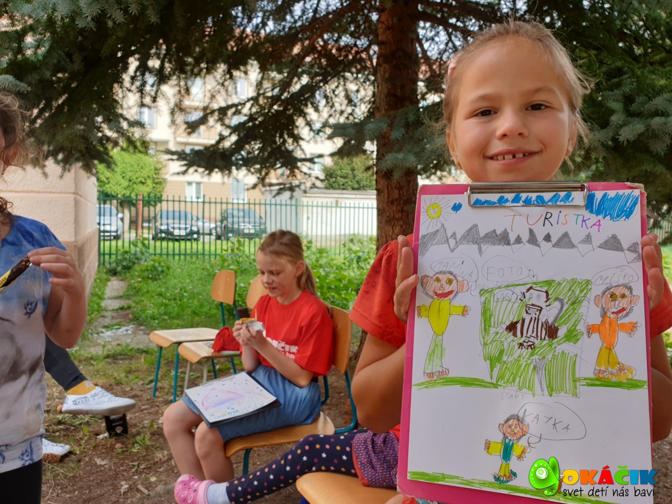 Dnes sme s deťmi tvorili na voľnú tému vonku, v príjemnom chládku vysokých smrekov. Pozrite si pár záberov. 🙂 Touto cestou ďakujeme firme Happylife za zdravé a chutné bio raw mandľové tyčinky a Fajnô maškrtenie – Bezgluténové pohánkové oblátky bryndzové a syrové. Všetkým veľmi chutili a energia spálená kreslením sa rýchlo dobila
