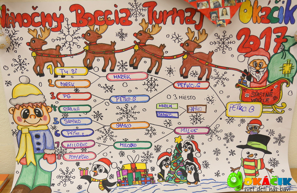 14. 12. 2017 sa v Okáčiku uskutočnil v poradí už 4. ročník Vianočného turnaja v Boccii. Zúčastnili sa ho naši „utorkári“, ktorí Bocciu pravidelne trénujú. Samotnému turnaju predchádzal program, v ktorom sme privítali Mikuláša, strigu Luciu, predstavilo sa duo „Horúca láska“, s víťaznou choreografiou „Me&You“ sa predviedla tanečná skupina „P&E“, Anetka s Peťkou nás pobavili na skladbu „Boky jako skříň“, zatancovali tiež Miloš s Evkou a veľmi pôsobivé bolo aj záverečné vystúpenie „Zimné víly“. Víťazom turnaja sa stal Peter Gregor. Na druhom mieste sa umiestnil Miloš Muller a tretie miesto vybojoval Samuel Putiš. Víťazom srdečne blahoželáme. Po turnaji odštartovala gitarová párty s Palim a disko karaoke, kde sme sa všetci do sýtosti zabavili. Ďakujeme všetkým za pomoc a podporu pri organizovaní turnaja.