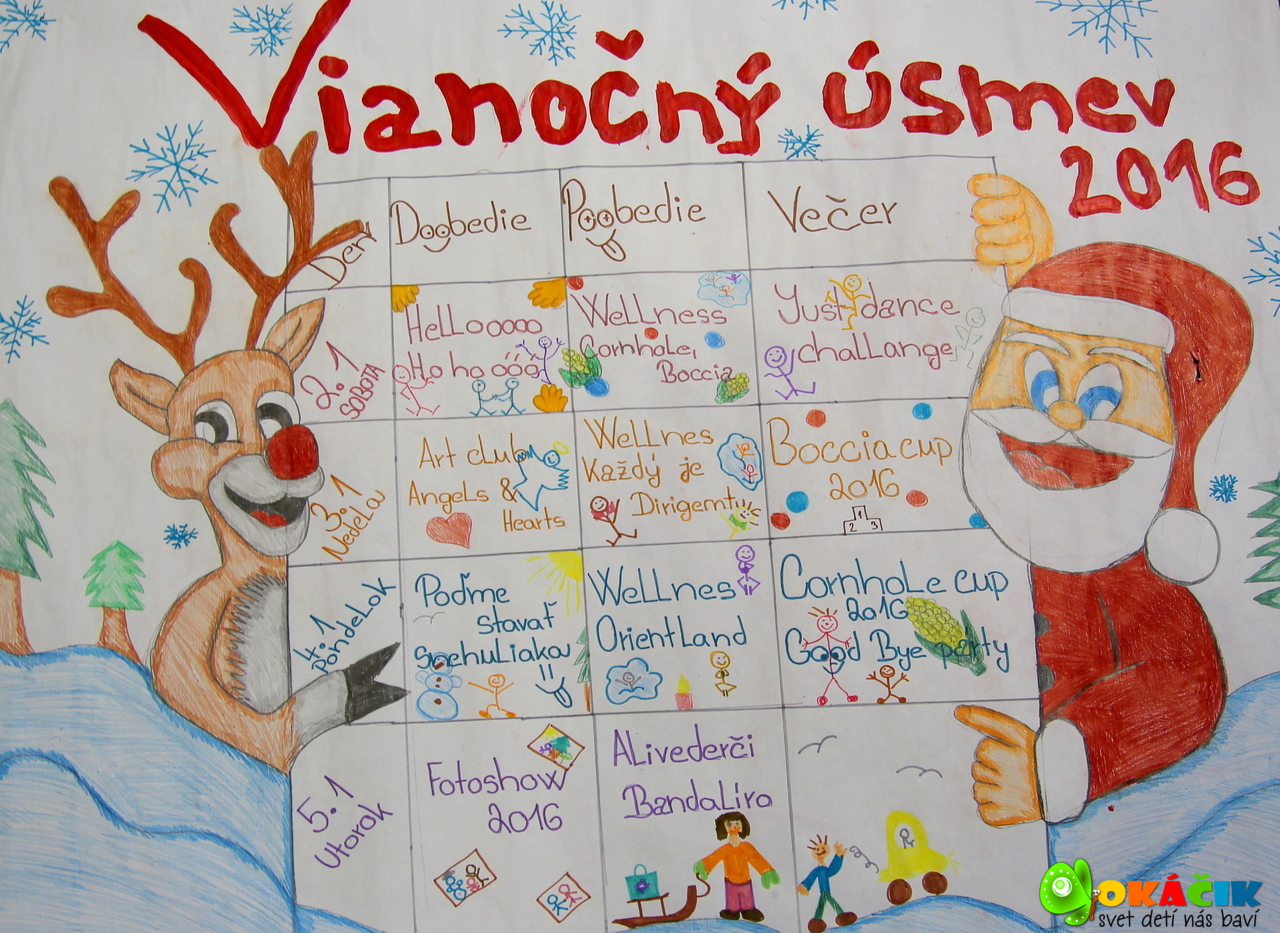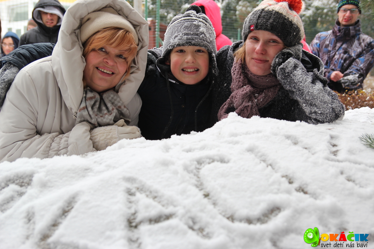 Ho ho óóh milí priatelia. Tak vidíte, že zázraky sa dejú. Nakoniec sa nám tú Perinbabku predsa len podarilo dostať z dovolenky domov a nasnežiť. Super sme sa vytešili, vygulovali a postavili síce mini snehuliaka, ale o to s väčšou radosťou. A vlastne na čo sa nám ju podarilo prilákať? Videl ju niekto z vás? Maľoval jej niekto srdiečko na líčko? Musíme sa asi opýtať najmenšieho anjelika Laurinky, možno ju zazrela pri maľovaní svojho umeleckého diela. Alebo skôr Vratka či ju nepriviezol na tom novom aute. V boccii ani Cornhole nevyhrala, nenaťahovala si ani pančuchy na hlavu. Hmm, to mi je záhada, neprišla ani s Jankami a Peťom, dokonca ani pani Anička o nej nepočula v jedálni. Počkajte zavolám Samkovi a Danke, možno ju videli, keď sa skrývali vzadu s tortou pre Ľubku. Tak nič, vraj tam bola tma.  Asi na to neprídeme, ale hlavné je, že prišla a urobila nám radosť. Určite jej tam s nami bolo príjemne, tak ako všetkým. Posielame vám 156 usmievavých spomienok na krásny začiatok Nového roka s Okáčikom. Ďakujeme všetkým skvelým ľuďom, ktorí sú neoddeliteľnou súčasťou tohto projektu a pomáhajú nám robiť radosť iným. Všetkých vás pozdravujeme a tešíme sa na ďalšie stretnutie.